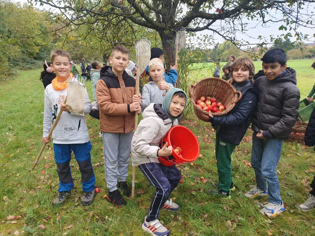 Am Montag, dem 22.09.2025 ging es für die rund 70 Kinder der vierten Klassen raus auf eine Streuobstwiese. Ziel des Tages war es, Apfelsaft herzustellen und dafür mussten die Kinder einiges tun. Zunächst wurden Äste geschüttelt und hunderte von Äpfeln fleißig eingesammelt. Danach wurden sie an Stationen weiterverarbeitet: gewaschen, geschnitten, zerhäckselt und gepresst. Das Ergebnis war eine Menge Saft, die laut den Kindern viel besser als aus dem Supermarkt schmeckte.