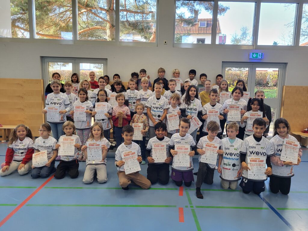 Stolz brachten die erfolgreichen Lindenschüler:innen ihre T-Shirts, Medaillen und Urkunden mit in die Schule, um sie auf unserem traditionellen Kirbelauf-Foto zu verewigen.